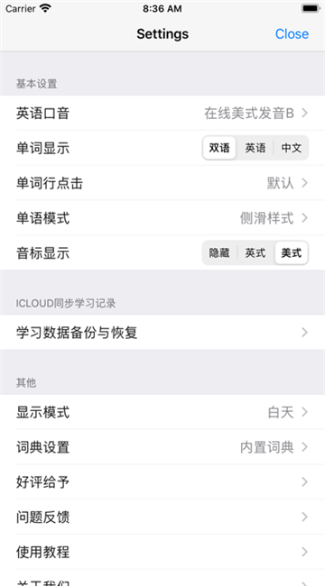2.点击单词行的左半部分,只有发音,右半部分,保留默认设置;