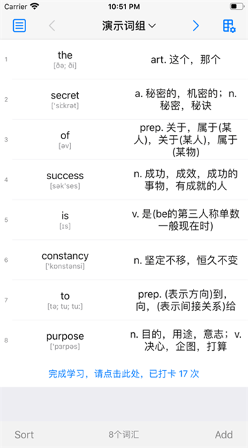 2.只显示英文时,向左滑动单词行,可以看到中文释义。