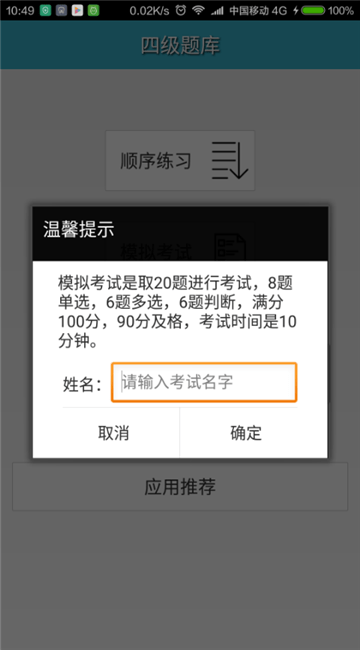 1、拥有模拟考试的温馨提示,当点击模拟考试后会跳出输入姓名的方框并提示内容;