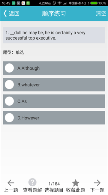 口袋英语4级安卓版是一款英语四级考试备考学习软件,在这里为用户提供大量习题练习,你可以安装那好顺序练习和模拟考试练习,每一道题都有详细的解析,在做题过程中会为你形成我的做题,帮助查漏补缺,快来单机8下载使用吧!