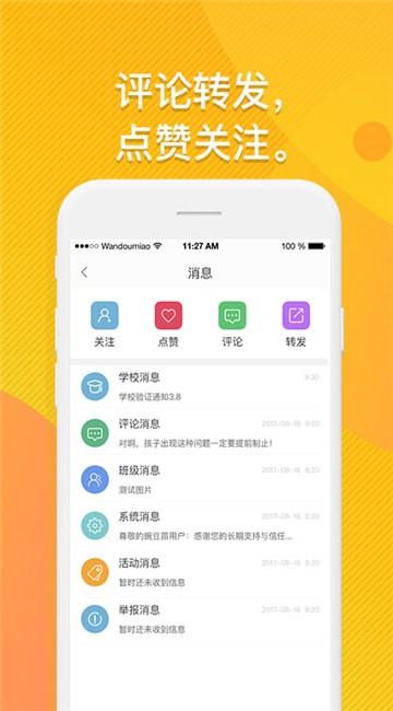 2、点击消息,为用户提供学校消息,评论消息,班级消息等相关信息