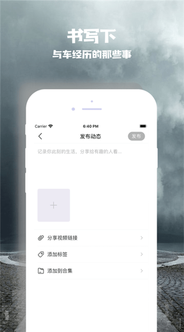 [个人发布]打开发布页面,可以上传各种文字图片视频等各种关于车的内容,让你的短视频在俱车社循环播放吧!