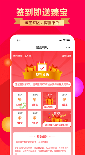 5、签到领臻宝:每日App内签到,天天签到,天天换优品,实惠;