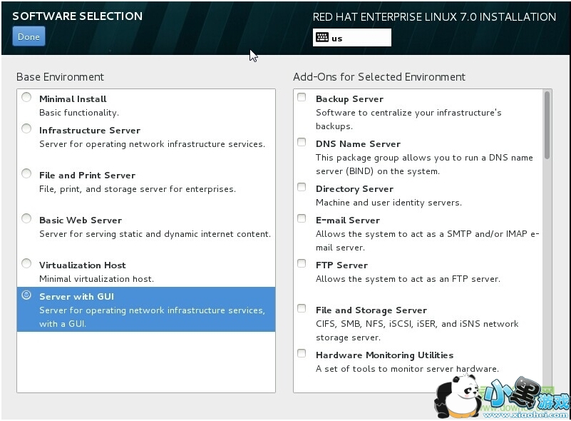 8. 选择要安装的软件包,选择GUI,系统将以图形用户界面登录