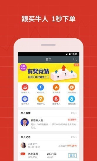 首页中间部分的总收益榜,日赛榜,周赛榜,月赛榜;用户可点“关注”成为牛人的粉丝,实时了解牛人动态;可以查看对应栏目榜单牛人的主页及牛人持仓信息