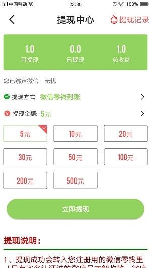 首次满5元即可申请提取,之后10元起,支持提取到微信钱包;