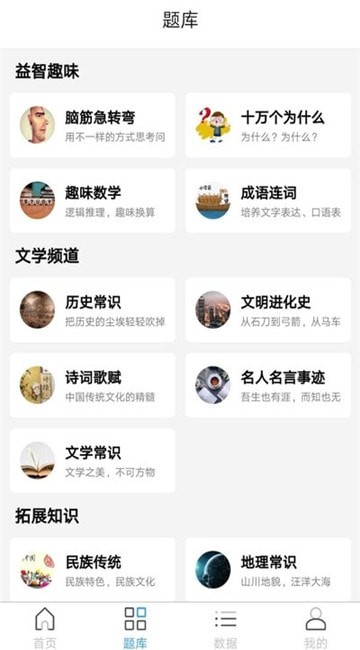 我们准备了10w+的题库等你来答,自然科学、趣味数学、文学常识、体育常识、医学基础知识等等,你想得到了我们都有。
