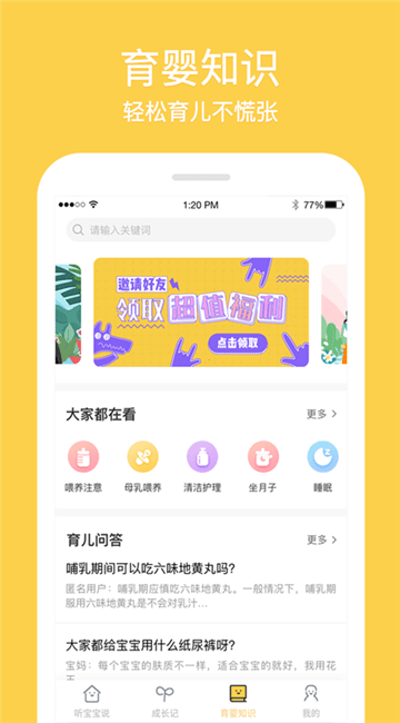 定期更新育儿常识、内容涉及宝宝各生理周期反应、健康饮食等,让宝妈从容应对。