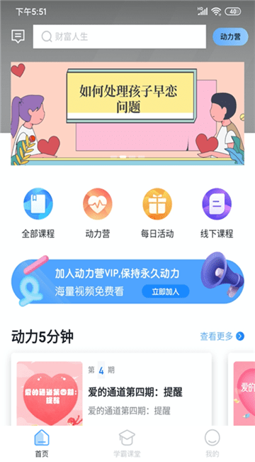 6、动力学社内容涵盖财富密码、幸福婚姻、亲子关系、人生智慧、经营之道、开悟人生、育儿之道、家风家教八大版块以及K12专栏。