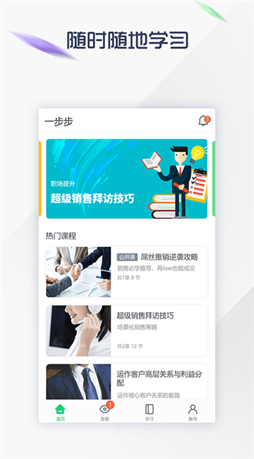 一步步免费版是一款专门为学习制作的教育学习培训软件,用户可以进行超级轻松有效的学习方式,让你更好进行高效学习,随时随地进行学习,任何地点都阻挡不了你学习的热情,还能进行在线模拟考试,为组织培训提供的工具。APP是学员在学习过程中的平台,通过一步步系统进行分配账号,记录学习时长、记录、以及进行考试,获得证书等行为。让学员在学习过程中寓教于乐,轻松解耦工作与学习的时间关系。让学习变得更轻松,更有趣,更高效。