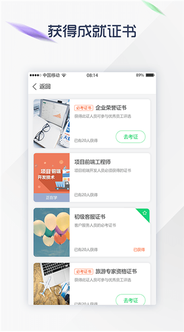 学员收到组织分配的账号后,登录本APP,可以免费参与内部培训,通过考试后还能获得证书。