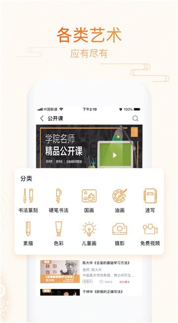 公开课涵盖书法篆刻,硬笔书法,国画,油画,速写,素描,色彩,儿童画,摄影等艺术门类,更有海量免费视频课程可供学习.购买后免费更新,实时点评提问.名师名课,你还在等什么?