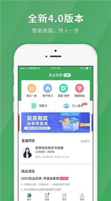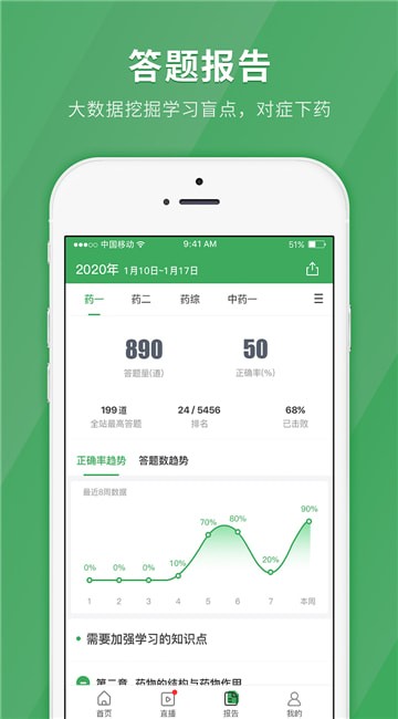 执业药师快题库app是一款考试辅导软件,用户在应用中就能找到名师的直播课程,应用每晚都有对应的直播讲堂可观看,接受名师的精讲课程,跟随名师的讲课,轻松从头学起,加强对知识的理解,巩固对知识的认知,让学员灵活的运用知识点;课程学习后即可练习同步试题,做题后就能看到专属答题报告,大数据挖掘学习盲点,对症下药更具有针对性,系统汇总了正确率趋势和答题数据的趋势,所有的进步都能看到,还能根据做题情况统计出学员不熟练的题目和需要加强学习的知识点,指引学员学习的方向。快来单机8下载使用吧!