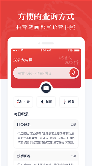 汉语大词典安卓版是一款在线查字的服务软件,可有效帮助用户及时找到自己需要了解汉字信息,用户只要在应用中输入需要查询的汉字,即可快速为你呈现。并可还能为你呈现出精细的释义,以便用户可以更加清楚的掌握汉字的意思。app为用户提供了搜索查字、语音输入、拍照查字、按偏旁查字、拼音查字等多种查字方式,用户可以根据自己的需求,选择性在线查字,便捷更高效。汉语大词典安卓版还为用户查询的字提供近义词、反义词以及同义词等信息,可全方面帮助用户详细了解每一个字的信息,提升用户对汉字的认知面。