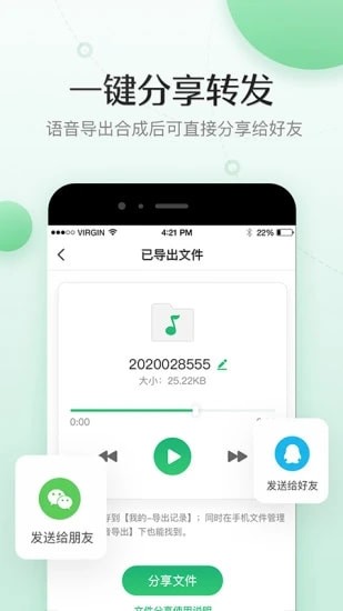 语音导出合成工具app是帮助我们整理微信语音文件的应用,支持进行多条语音合并导出,也支持单条导出;并且整理后的语音文件可以直接转发到微信群或是转发给微信好友,简单操作就帮助我们打破了微信语音无法转发分享的局限;讲课、办公、学习等场景都非常适用,直接用app将老师的音频课程整理出来,让碎片化的语音消息变为整体规范的学习资料,更方便进行知识复习;支持同时管理多个微信账号,如果您有进行微信分身账号登录,同样可以使用app进行语音文件整理,解决账号切换烦恼,节省资料整理时间,提升工作高效率以及学习效率。