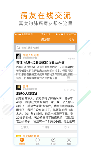【病友在线交流】为广大肺癌患者提供沟通病情、解惑答疑的在线交流,聚集每一位肿瘤患者力量,齐心协力战胜病魔。