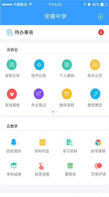 云办公:校园门户、校内公告、个人通知、批办公文、在线保修、外出登记、教师请假、教师博文、局校公文。