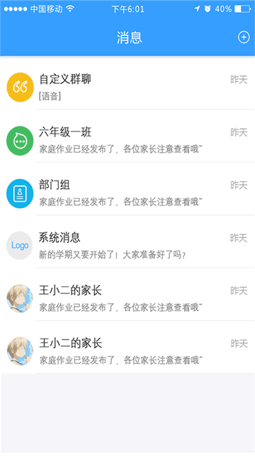 消息:全校通知、教师的话、以及各个分组的消息通知。