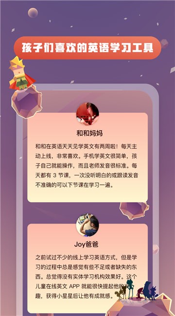 英语天天见免费版是一款专为5-12岁孩子提供掌上英语学习服务的平台,它采用纯北美外教直播形式,结合组队比赛的游戏模式,为孩子提供沉浸式的英语学习环境,每天睡前15分钟,轻松学习英语,提高孩子的英语成绩;本平台入驻大量专业外教老师,具有全新的科学教学手段形式,具有多年少儿英语授课经验,针对不同孩子提供最佳的教学方案,家长放心,孩子学习效率更高;通过加入分组,进入的课程会被分为两个队伍,两支队伍需要通过互动答题进行竞赛,每组学生都可以参与答题,答对后不仅自己可以获得星星奖励,所在团队也会获得,从而从小培养孩子的团队意识,一起进步。