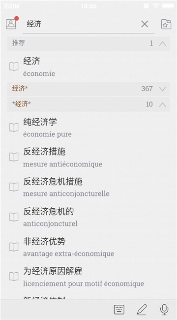 国际商务法语词典手机版是一款汇聚了海量商务专用词汇的法语词典,具备中法翻译翻译需要的人可以安装这个法语词典app在手机上,这样的话,当自己需要查询法语单词、中法翻译的时候就可以直接打开词典进行操作,这个词典可以提供兼容中文和法文的输入法,可以根据中文查询法文,也能根据法文翻译为中文,二者可以实时互译。而且这个词典之中收录的法语词汇大多都是商务活动中出现的专用名字,需要翻译专用名词的时候可以在此查询词汇,每个词汇都有着教读的音频和例句,用户可以一边查询法语商务词汇一边学习,可以不断丰富自己的法语词汇量,赶快下载体验吧。