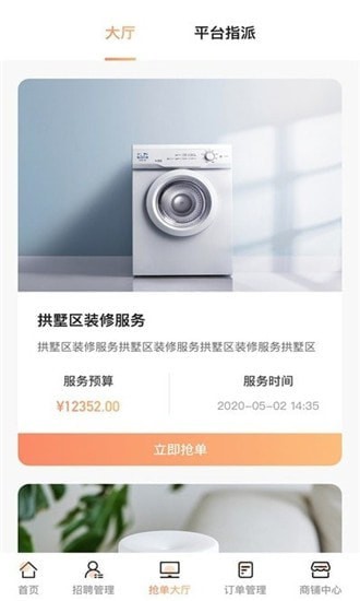3、还有专门的抢单大厅,方便广大商家直接自己来抢单,提高了办事的效率。