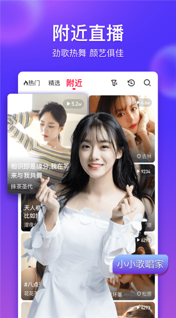 流畅高画质的真人视频直播画面,Live现场震撼音效,真人视频直播,让你随时随地享受演唱会般超high秀场气氛。看真人视频直播才艺show,听K歌达人激情欢唱,视频聊天,享受超凡视听盛宴。