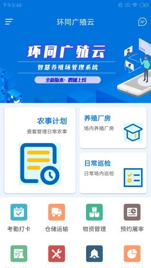 包括“养殖厂房”、“农事计划”、“日常巡检”、“预约屠宰”、“仓储运输”等功能,
