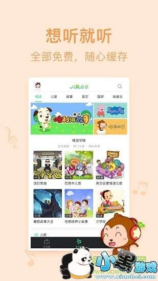 涵盖经典中文儿歌.热门英文儿歌,巴塔木.宝宝巴士.萌宝童谣.手指谣.hooplakidz.hello hippo.little fox.兔小贝.网趣宝贝等多品牌汇集,儿歌唱不停~