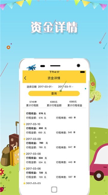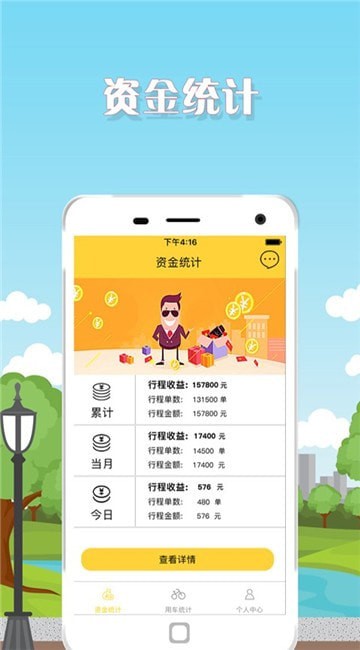 1.资金统计:提供收益核心数据,包括行程单数、行程金额、行程收益查询;