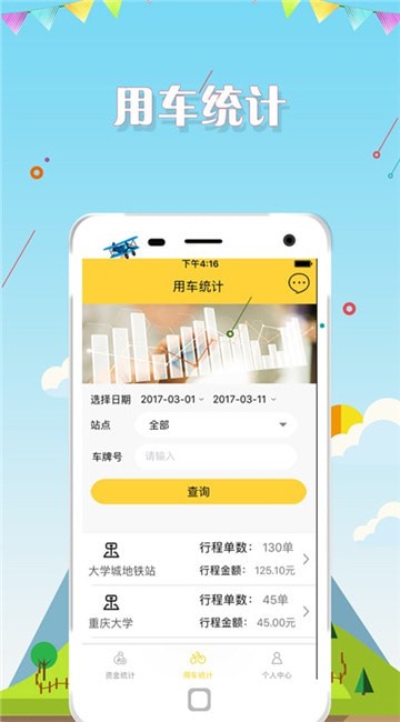 2.用车统计:提供经营核心数据,包括站点用车统计、单车用车统计、单车用车详情等;