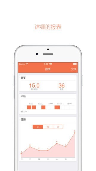报表:支持总番茄使用时间和番茄数量统计,支持今天/近7天的番茄时间的分布甘特图的展示,支持日/周/月三个维度的执行番茄数的趋势图展示