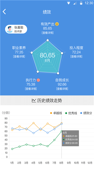 系统会根据员工一个月的工作情况进行统计,员工可以在绩效也页面看到自己本月的工作效率