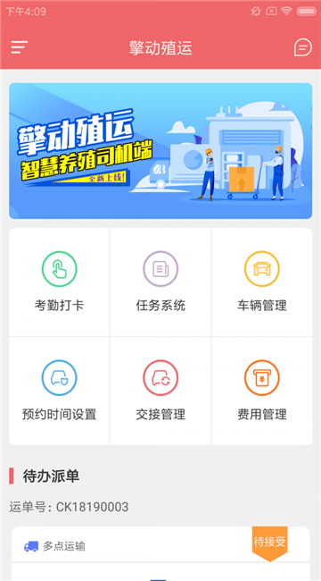 擎动殖运物流是一款物流管理服务软件,该软件为物流公司提供考勤打卡、任务系统、车辆管理、预约时间管理、交接管理、费用管理的功能,司机能够通过该软件实时查看运输订单详情,快来下载使用吧!