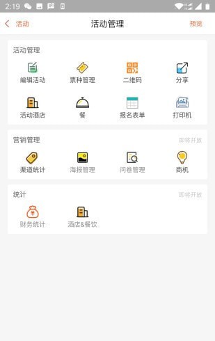 创建会议,转发会议,报名统计,签到统计,制证(需配合打印机)等;以及会议票务管理,会议酒店管理,会议餐的管理等。