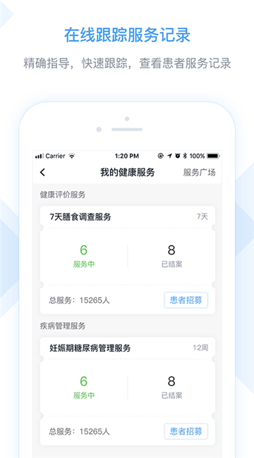 线上工作室多终端数据同步,确保患者数据跟随医生移动;所有健康服务均有健康管理师配合全程跟踪服务,最大程度减少医生工作量,高效管理患者的同时提高患者积极性与依从性。