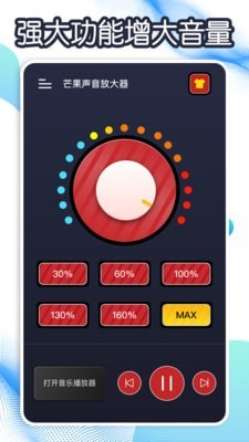 芒果声音放大器是一款全新上线的音量管理app。当你的手机需要发出响亮的声音时,可以用芒果声音放大器来做音响,还可以播放手机里的歌曲并最大的提高音量,不受系统声音限制,戴上耳机后效果更佳。后台运行和极低能耗,支持网易云音乐、qq音乐等多种播放器,即使锁定屏幕,软件也可以正常使用。