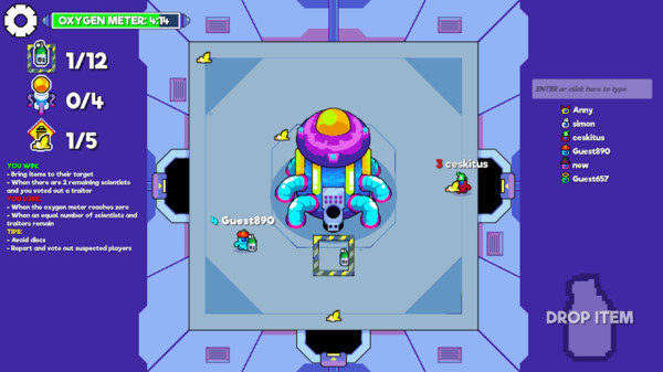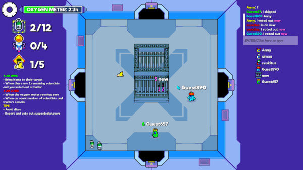 危险!危险!氧气含量... 10%收集所有氧气罐,避免致命的光盘。在我们当中2.0是一款在线多人社交演绎游戏,您需要共同努力才能生存。如何以叛徒的身份获胜,如何赢得科学家,将物品带到目标。