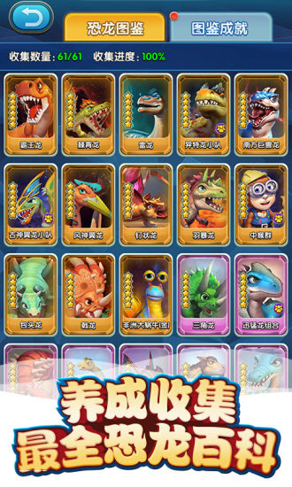 玩家可以通过日常任务及掠夺获得不同品质的龙蛋,孵化龙蛋后可以随机获得一头恐龙,大部分龙蛋都有几率孵化出顶级恐龙。游戏根据真实权威史前资料制作上百种稀有恐龙,每一头恐龙都各具特色,如何策略搭配才是取胜的关键。