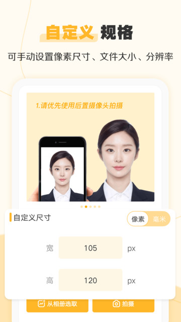 1.上百种证件照规格尺寸满足您的各种拍摄需求 输入关键字,即可智能搜索。
