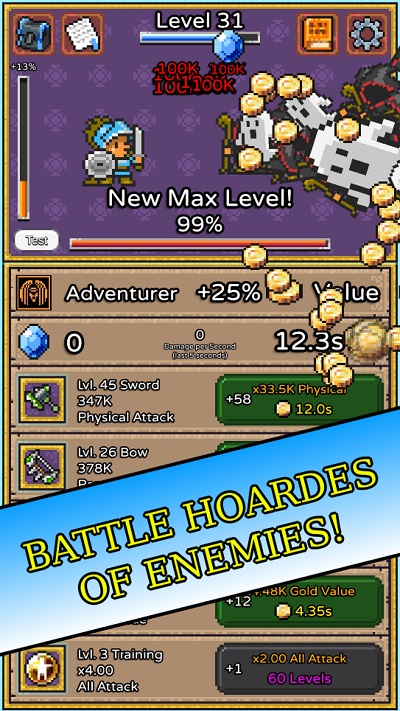 游戏采用经典的像素风格作为游戏背景,以独特的地牢闯关作为游戏的主要玩法。在游戏中,玩家能够体验到众多关卡模式玩法,非常简单粗暴的回合制战斗等待玩家挑战,感兴趣的玩家不要错过,快来下载吧!