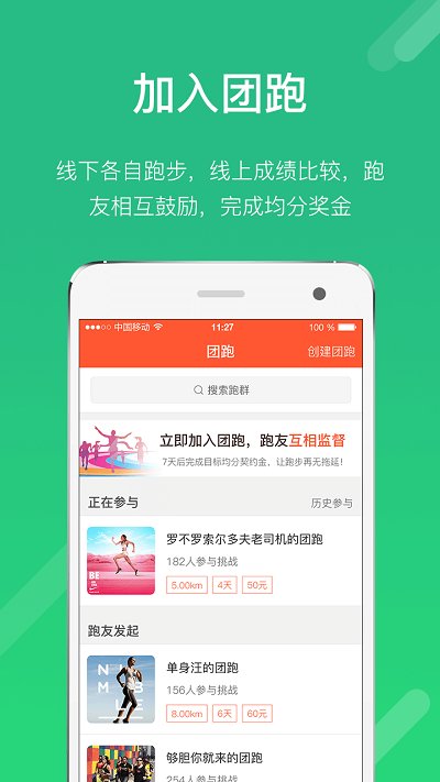 特色一:加入或创建团跑,可以结交新的跑友,也可以带动亲朋好友一起运动收获健康,大家互相监督,挑战不可能;