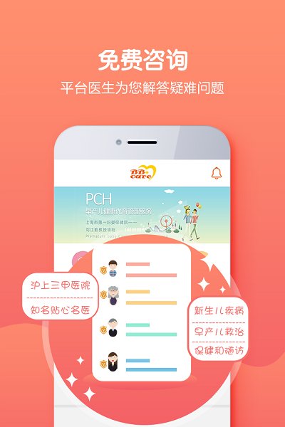 B-care贝生超级医生入驻全国多家知名医院,拥有专业的儿科医疗团队,全方位守护孩子健康。在线医生24小时咨询;免费私人医生专属服务;儿科专家团队一键预约;生长发育评估;健康跟踪随访;实现智能监测。