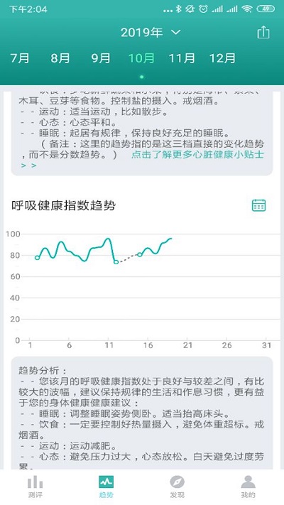 展示硬件设备监测到的心率、呼吸率,睡眠结构等数据,在此基础上,从服务器获取评估的用户心跳健康指数、呼吸健康指数和睡眠质量指数以及三个指数的变化趋势,提供健康参考和相应的健康建议,并提供查看亲友数据、实时监测用户心率、呼吸率的功能
