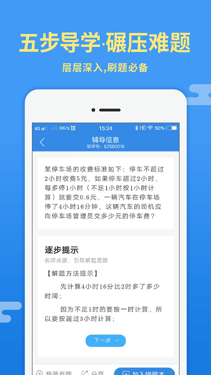 导学号是专为中小学生打造的专业辅导应用。导学号app与全国各大辅导书籍出版社强强联合,做作业遇到不会的问题,只需要输入该题目对应的导学号,就可以直接获取辅导信息。输入题目对应的导学号,秒级获取辅导信息。通过特有的“五维思训法”,从逐步提示开始,像老师一样启发思路、总结训练,最后推荐课程精讲,真正做到一题一号,精准回复,100%原题辅导。