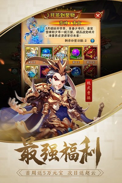 全年365天,平均每天可从游戏内获得至少300元宝,首周直送30000元宝,让你HIGH到爆!登录第七天,赵云、太史慈、张辽、张角4名顶级橙将,任你挑!更有最高品质红色武将关羽、周瑜、曹操、左慈登陆即送……最良心的手游,没有之一!
