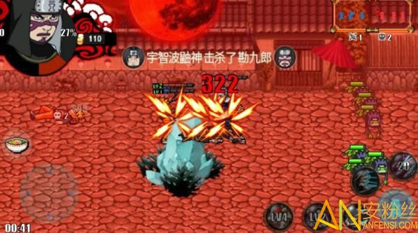 2、横板格斗类游戏,玩法操作是蛮简单的,游戏里点击按键玩家控制人物发动忍术攻击敌人,点击虚拟键盘控制人物的走位;