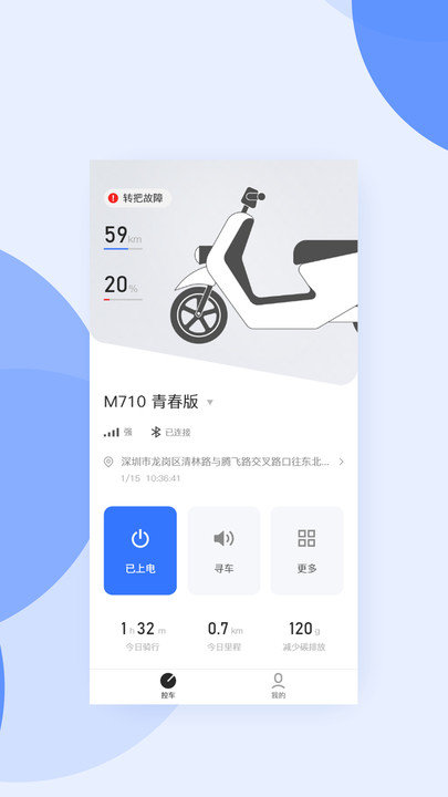 查看车况信息:一键车检、车辆定位、剩余电量、行驶里程、骑行轨迹、数据统计。