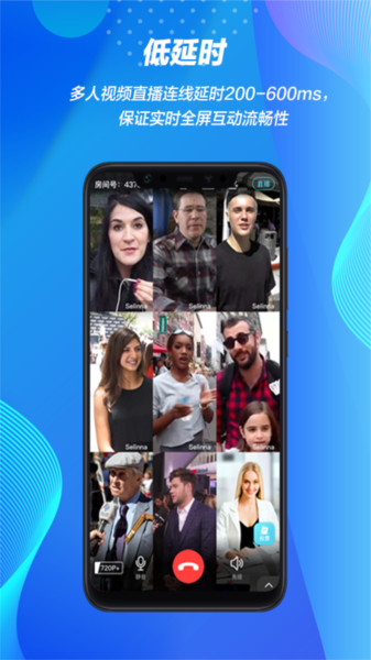 低延时:多人视频直播连线延时200-600ms,保证实时全屏互动流畅性。