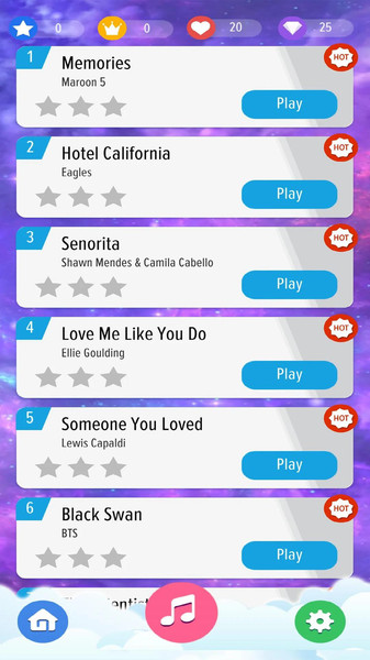 魔法钢琴块游戏有着绚丽的游戏场景,以星空为游戏背景,打开游戏就会被吸引目光。游戏有着两种模式,一种是普通闯关模式,这种模式以一首歌为单位进行评星,最高是三颗星。另外一个无尽模式,这个模式以分数为评判目标,分数无上限。你可以享受两种玩法,看看更喜欢哪种吧。