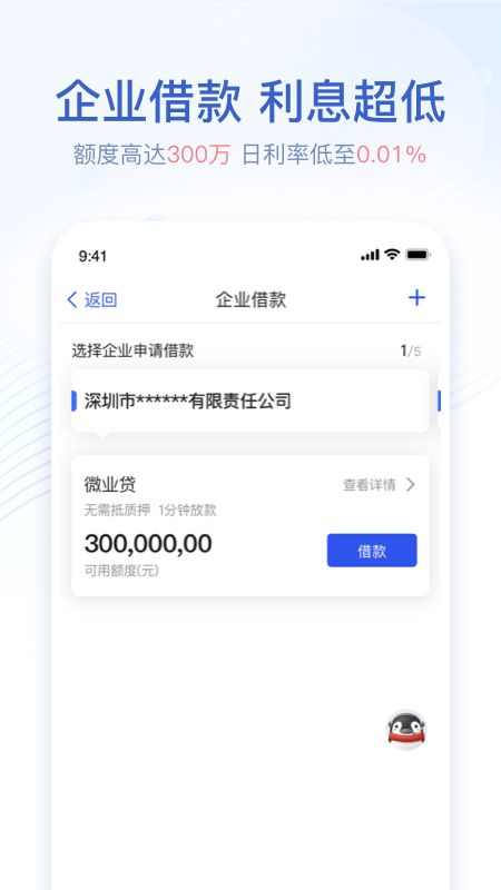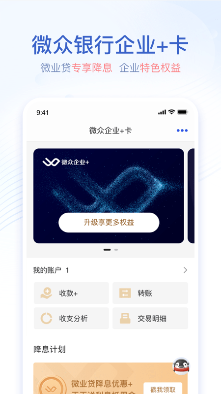 腾讯牵头发起设立的国内首家互联网银行,持有银行牌照。为小微企业主提供账户查询、转账支付、银企对账、业务咨询等金融服务,让小微企业直通银行。